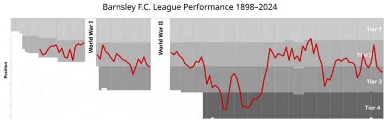巴恩斯利只有一次英超之旅,但也从未跌落至第四级别以下的非职业联赛,大部分时间内都在英冠和英甲赛场徘徊。