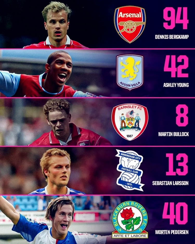 巴恩斯利只有一个赛季的英超经历,顶级联赛助攻王是布洛克(8次助攻)。